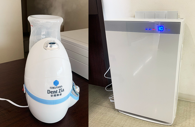受付・待合室には次亜塩素酸水対応超音波噴霧器を設置し、診療室には空気清浄機を常に稼働させ、院内の換気、空気清浄に努めています。